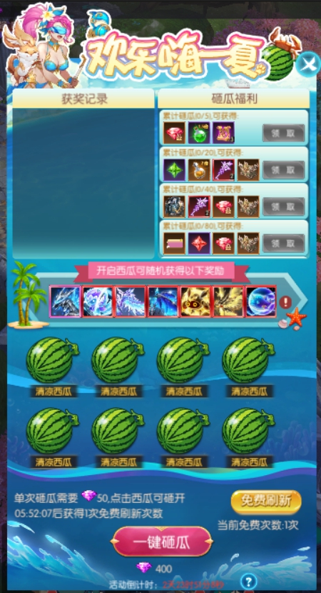 3."清凉西瓜"与"避暑金瓜"有开出极品大奖,"盛夏彩瓜"砸开必得极品奖励