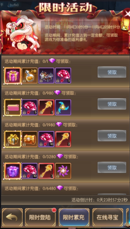 活动简介:活动期间,累计充值达到一定金额,可领取游戏为你准备的返利豪礼