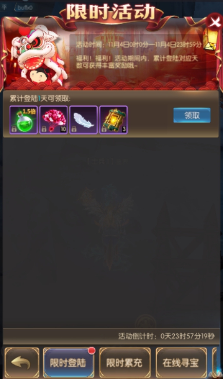 活动简介:活动期间,累计在线一定时常可获得寻宝次数,寻宝可获得珍稀奖励。寻宝次数每天零点重置。