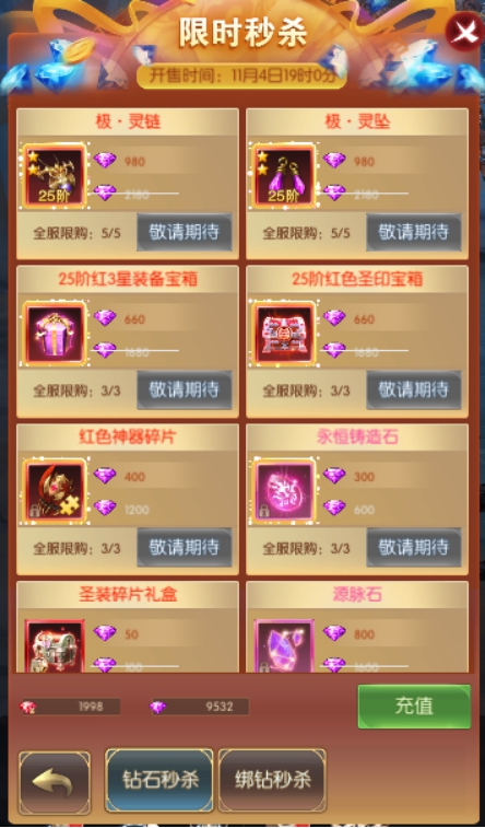 活动简介:活动期间,玩家能以超低的价格秒杀原价道具,机会不容错过。