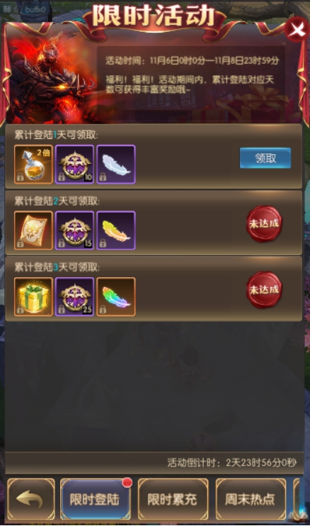 活动简介:福利!福利!活动期间内,累计登陆对应天数可获得丰富奖励哦~