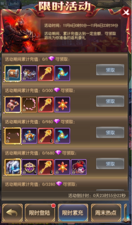 活动简介:活动期间,累计充值达到一定金额,可领取游戏为你准备的返利豪礼