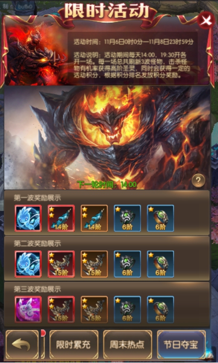 活动简介:活动期间每天14:00,19:30开各开一场。每一场总共刷新3波怪物,击杀怪物有获得高阶圣灵,同时会获得一定的活动积分,根据积分排名发放积分奖励。
