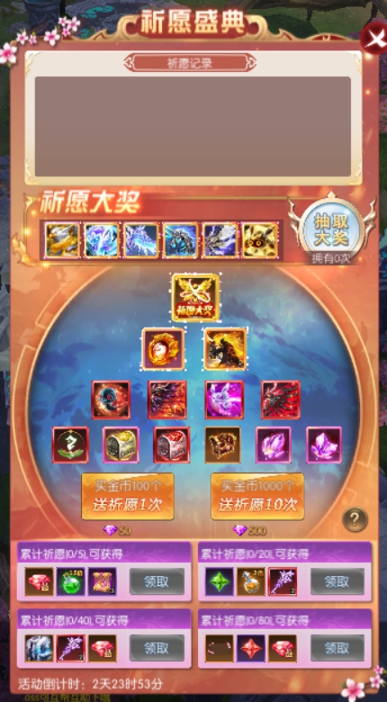 活动简介:活动期间可以消耗钻石购买金币进行祈愿,每次购买会赠送一个祈愿奖励 ;在奖池中抽到祈愿盛典大奖后,可在上方祈愿大奖奖池中抽取一次极品奖励(必然获得奖池中的极品奖励之一) ;祈愿达到累计次数可以获得对应的次数奖励,奖励多多 ;活动期间祈愿累计次数不会重置,活动结束后重置
