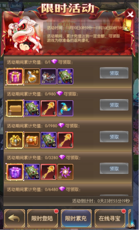 活动简介:活动期间,累计充值达到一定金额,可领取游戏为你准备的返利豪礼