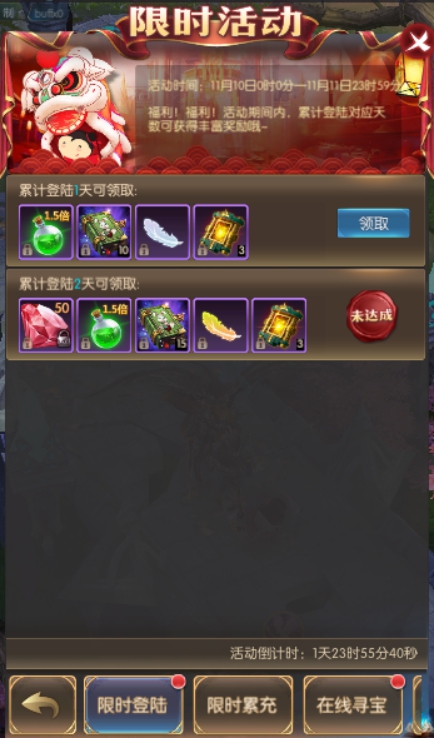 活动简介:福利!福利!活动期间内,累计登陆对应天数可获得丰富奖励哦~