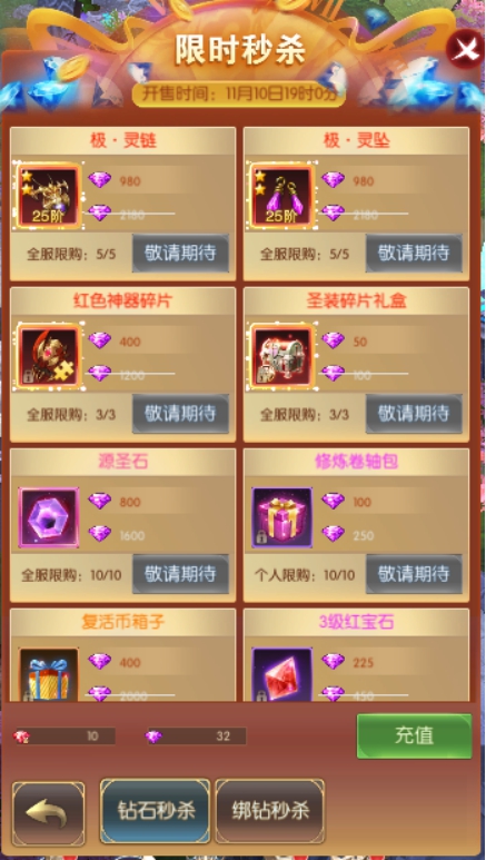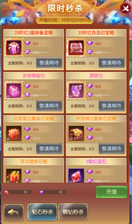 活动简介:活动期间,玩家能以超低的价格秒杀原价道具,机会不容错过。