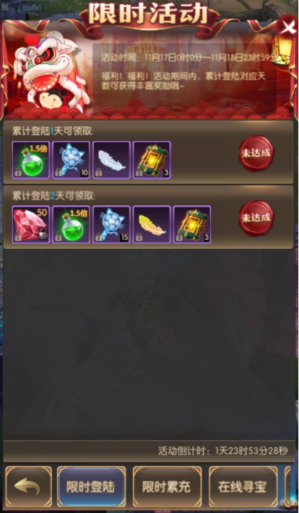 活动简介:活动期间,累计在线一定时常可获得寻宝次数,寻宝可获得珍稀奖励。寻宝次数每天零点重置。