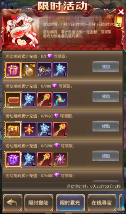 活动简介:活动期间,累计充值达到一定金额,可领取游戏为你准备的返利豪礼