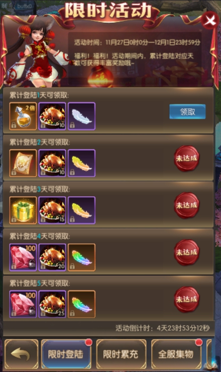 活动简介:福利!福利!活动期间内,累计登陆对应天数可获得丰富奖励哦~