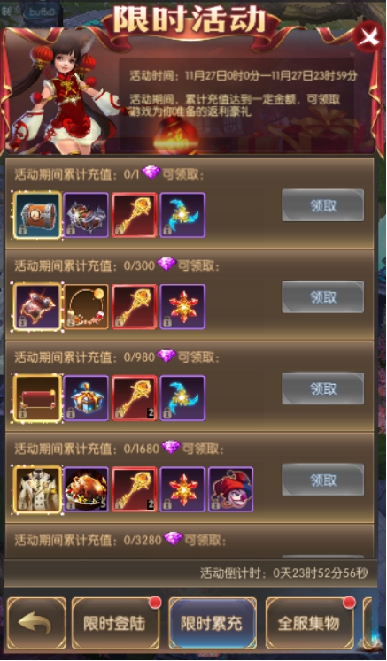 活动简介:活动期间,累计充值达到一定金额,可领取游戏为你准备的返利豪礼