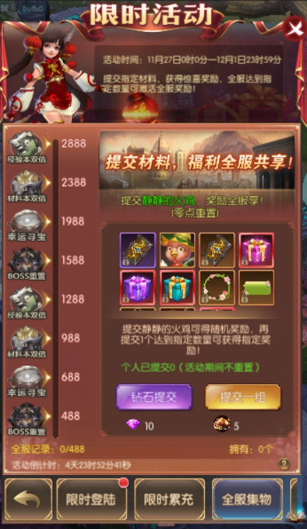 活动简介:提交指定材料,获得惊喜奖励,全服达到指定数量可激活全服奖励!