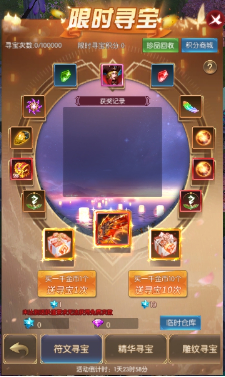 活动简介:进行寻宝即可获得丰厚奖励;限时寻宝时获得的积分,可在限时寻宝积分商城兑换珍稀道具,仅在限时寻宝开启时可使用,本次开启未用完的积分会保持到下次开启依旧可以使用