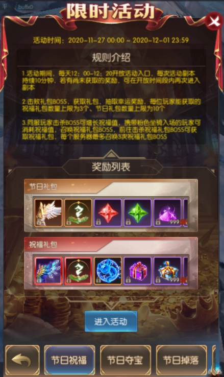 2.击败礼包BOSS,获取礼包,抽取幸运奖励,每位玩家能获取的祝福礼包数量上限为3个、节日礼包数量上限为10个
