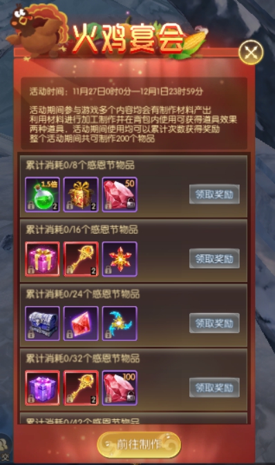 活动简介:活动期间参与游戏多个内容均会有制作材料产出,利用材料进行加工制作并在背包内使用可获得道具效果,无论何种道具,活动期间使用均可以累计次数获得下方奖励