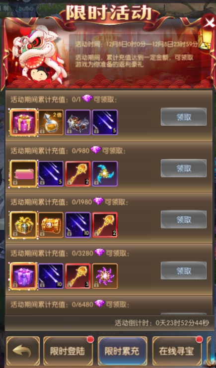 活动简介:活动期间,累计在线一定时常可获得寻宝次数,寻宝可获得珍稀奖励。寻宝次数每天零点重置。