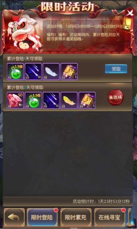 活动简介:福利!福利!活动期间内,累计登陆对应天数可获得丰富奖励哦~