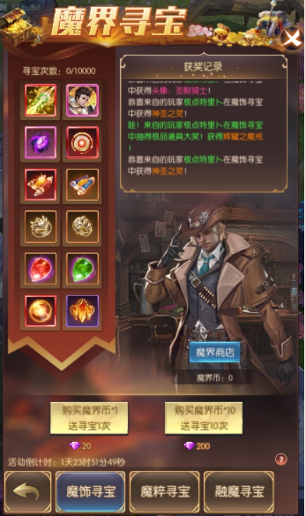 2. 进行寻宝可获得丰厚奖励;魔界寻宝时获得的魔界币,可在魔界商店兑换珍稀道具,仅在魔界寻宝开启时可使用,本次活动期间未用完的魔界币在下次活动开启时依旧可以使用