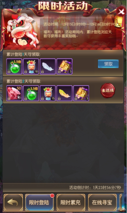 活动简介:活动期间,累计在线一定时常可获得寻宝次数,寻宝可获得珍稀奖励。寻宝次数每天零点重置。
