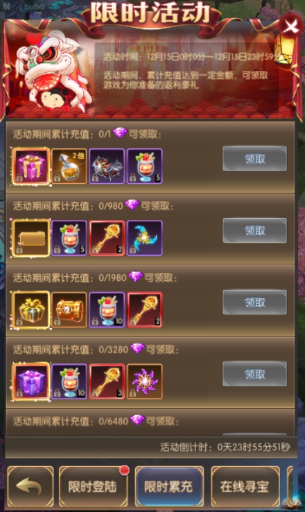 活动简介:活动期间,累计充值达到一定金额,可领取游戏为你准备的返利豪礼