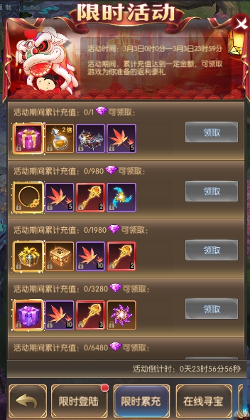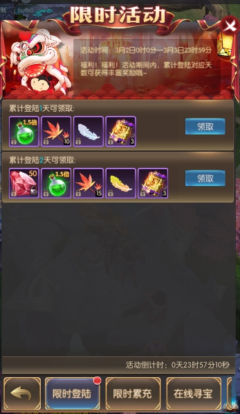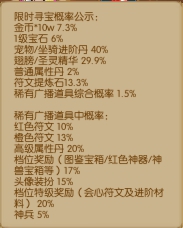 活动简介:活动期间,累计在线一定时常可获得寻宝次数,寻宝可获得珍稀奖励。寻宝次数每天零点重置。