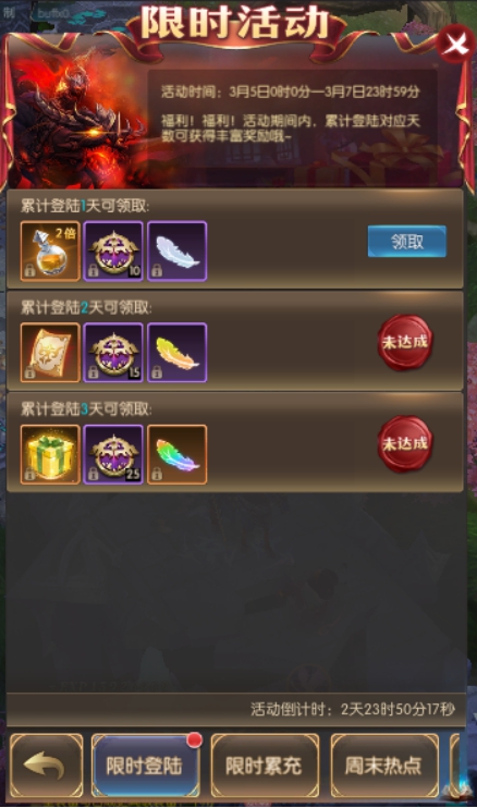 活动简介:福利!福利!活动期间内,累计登陆对应天数可获得丰富奖励哦~