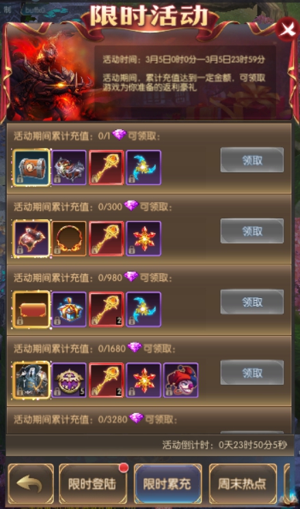 活动简介:活动期间,累计充值达到一定金额,可领取游戏为你准备的返利豪礼