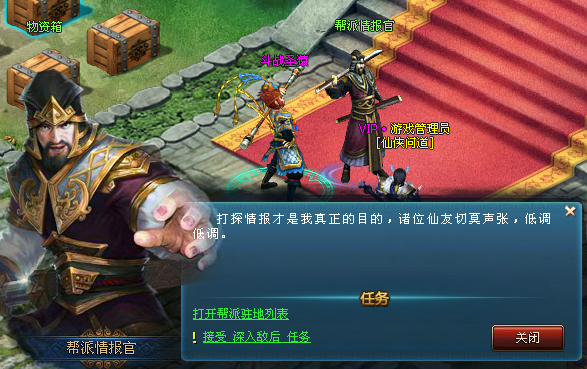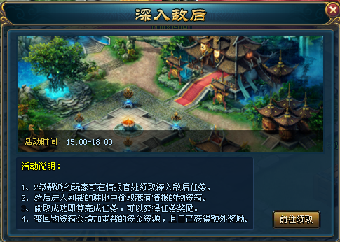 活动开启时间,通过主界面右上方的快捷图标进入帮派驻地,于帮派情报官处领取任务