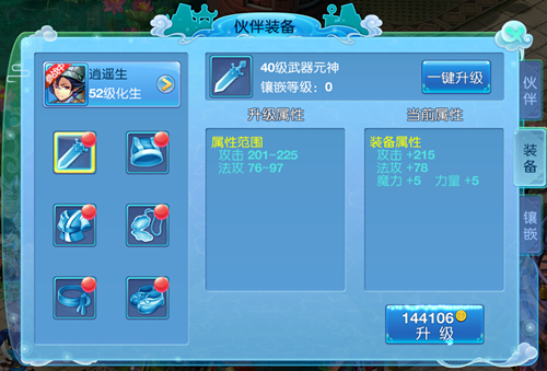 伙伴培养大家应该比较驾轻就熟了,主要是装备升级和宝石镶嵌。