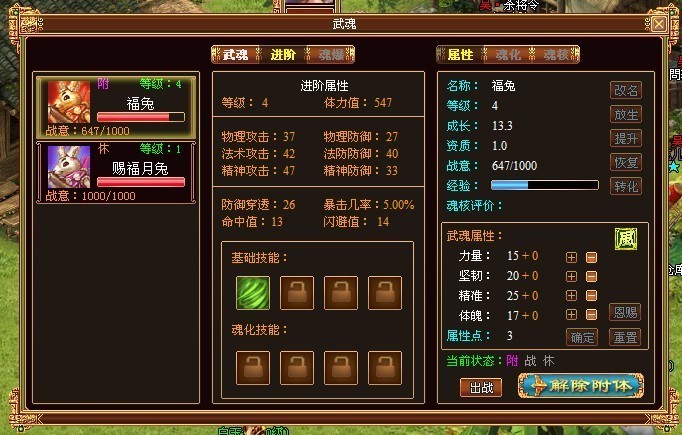 3. 附体后无法使用武魂的基础技能,武魂技能栏消失,在宠物系统第一期内容中,附体状态下的武魂只能够给主人提供属性加成。