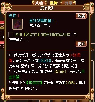 每次提升资质都需要1个【提资符】;每成功提升一次资质可使资质+0.1,点击“提升”按钮则弹出提示: