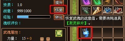 战意值即宠物的耐久度,上限为1000点(每只宠物都相同),当宠物处于出战与附体状态下,会逐渐减少其战意值,宠物战意值低于200点时,无法进行附体操作,当战意为0时,无法进行出战与附体操作,如果此时宠物已出战或附体,会自动变为休息状态。可通过点击“恢复”按钮来提升宠物战意值,需要消耗特定道具【聚灵碎片】。点击“恢复”按钮直接扣除1个【聚灵碎片】并回复100点;