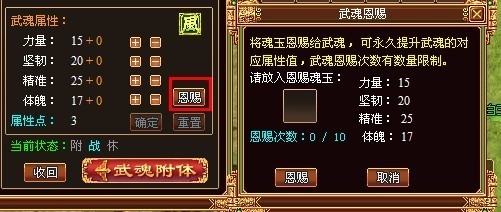 除了成长率以及手动配点会影响四项属性外,可以通过恩赐功能让武魂“服用”特殊的道具“魂玉”,从而永久提升某项属性值。每只武魂服用的魂玉有次数限制,当服用次数已满时则不能再服用。