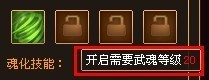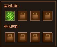 基础技能槽有4个,第1个技能槽为武魂的默认攻击技能,从武魂刚产生时就自动获得。当武魂等级到达20、30、40时,将能够分别激活2、3、4号技能槽。激活技能槽需要消耗绑定银两。