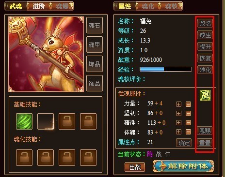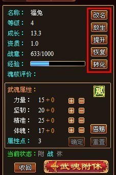 1. 在武魂附体状态下,被附体的武魂无法进行除“解除附体”外的其他操作,即无法更名、配置点数、转化经验等等,界面中的其余按钮均无法使用。