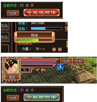 通过点击武魂界面的“武魂附体”按钮可将武魂附体至角色身上,此时人物角色身上会有明显的附体光效出现,同时人物头像窗口会有4399的改变以提示附体状态。