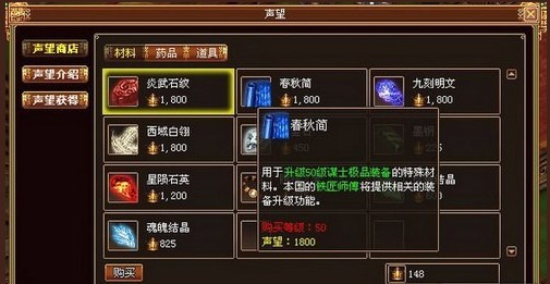 全新装备带来的惊喜更重要的是,升级的材料来自于声望商店,这对于所有的游戏玩家来说都4399收集到最新的装备。其中乌金石、墨钢是基本材料,而其它的都是特殊材料,各种职业特殊材料为义士的炎武石纹、谋士的春秋简、方士的九刻明文、羽士的西域白翎。而且购买不绑定,不过只有50级以上游戏玩家才能够在声望商城处购买。