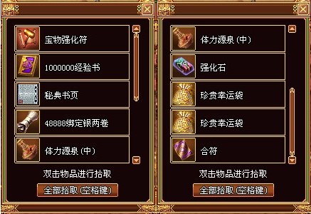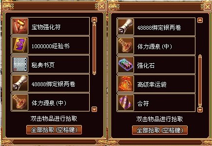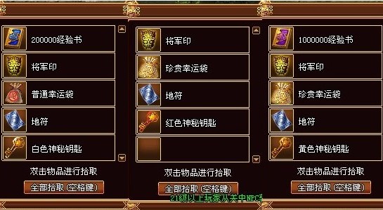一下分别是BOSS掉落的物品,如同上关一样会掉幸运带还有经验书,不过这次的经验书是200000经验书。还有就是召唤隐藏BOSS的道具以及进入隐藏地图神秘密室挑战BOSS的任务道具: