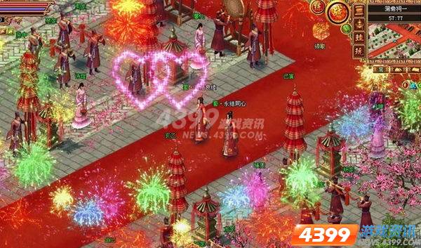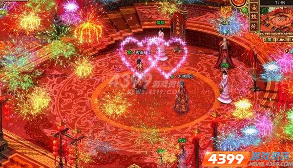 3)婚礼场景是十分宏大美丽的,在新人进入结婚会场"鸳鸯祠"后,会场可供新人及来宾使用60分钟,之后会将所有人传离会场。在结婚会场中,新人和找NPC月老进行结婚仪式,正式结为夫妇,二人同时获得夫妻关系及称谓。婚礼仪式时,若两位新人都身着新婚时装,则会出现绚丽烟火助兴贺喜。