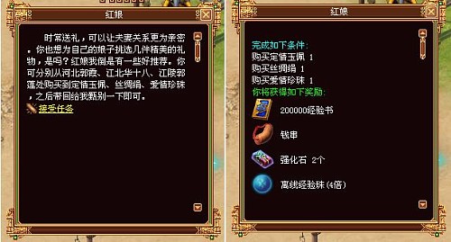 4)婚礼仪式完毕后,新人可从NPC月老处购买各种酒宴,邀请来宾饮酒作乐,共享结婚喜事。婚后的二人,每周可接取一次夫妻任务,完成后可得到丰厚奖励。 而奖励就先让大家来预热一下吧,奖励的丰厚诱人,可是让人很羡慕的哦!