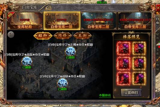 2、白帝宝库为本服副本,高级地图根据本服最大帝圣抗性开启,每个地图掉落不同部位白帝装备