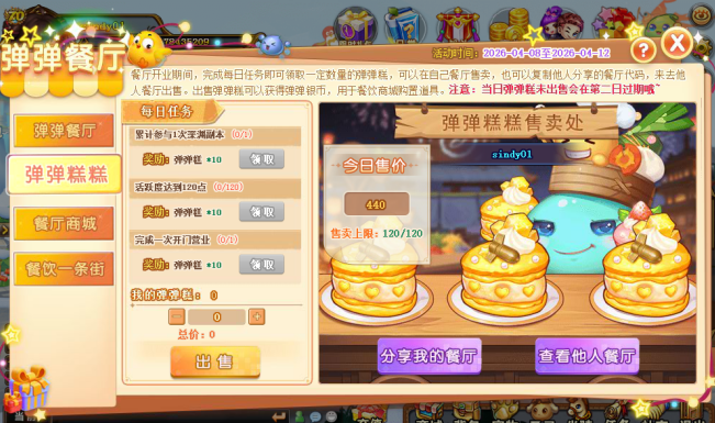 7.玩家每日完成弹弹糕糕页面的三个任务即可获得弹弹糕,可以在自己餐厅售卖,也可以前往他人餐厅进行售卖,餐厅分享码会每日刷新;