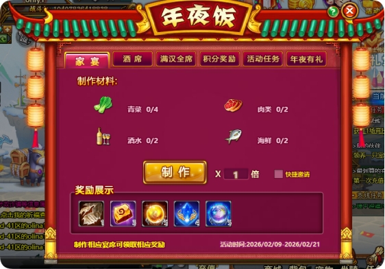 活动规则:活动期间成功制作任意档次的宴席可获得相应的奖励和积分,活动期间积分越多,即可领取累计积分奖励同时用于排行,在活动结束后根据玩家的排名发放相应的排行奖励。