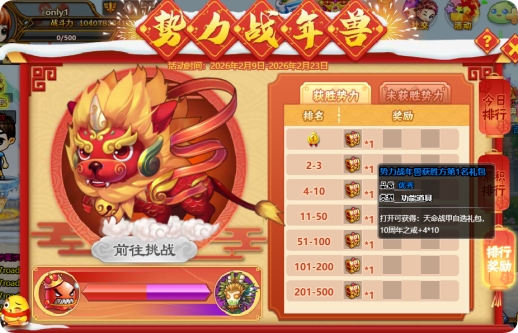 活动规则:新年竞技随机出没小年兽!打败小年兽可获得:年兽宝箱*1(内含:新春鞭炮 (活动兑换道具)*1,随机获得以下物品中的一个:修炼药水2级*1,魂晶盒(小)*1,蜕变晶石*1,灵魂石*1,战魂丹*3,星尘沙*1,琉璃珠*1,卡魂宝珠*1,随机卡盒*1), 集齐"新春鞭炮+招财猫"可兑换限定四星神宠哦!