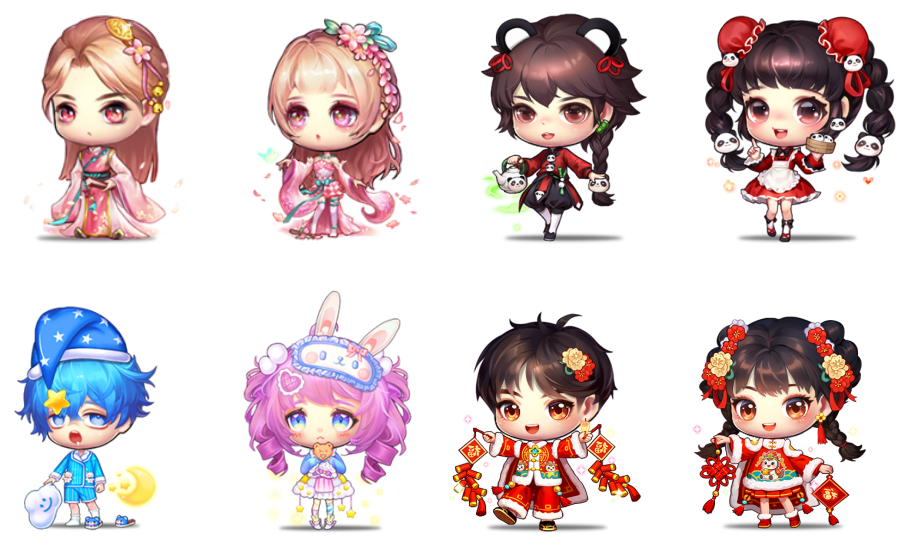 1、服饰展示(按顺序排列): 浮梦辞·男/浮梦辞·女、熊猫小茶师/熊猫小茶娘、月梦眠衣/星语梦眠、喜气洋洋/锦绣鸿运、戏梦狂欢/欢乐嘉年华;