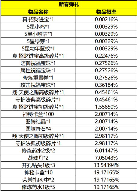 12、商城限时上架活动礼包:新春弹礼,内容概率如下: