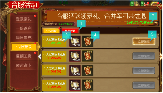 1) 合服后,军团所有人的活跃累计达到一定条件后,可领取奖励