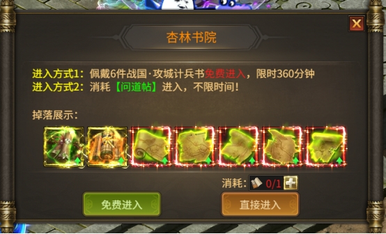1. 特殊刷怪地图,怪物数量极多且刷新时长短,可提供大量材料,并掉落【兵书】系列装备。