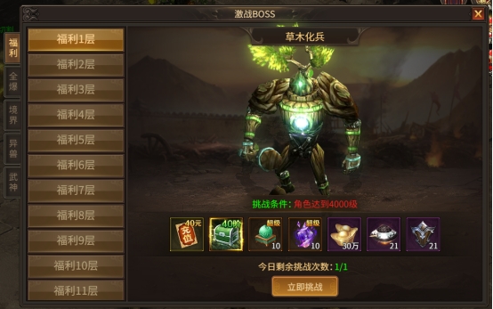 1. 福利BOSS:每日仅可挑战一次,可获取大量充值卡及道具