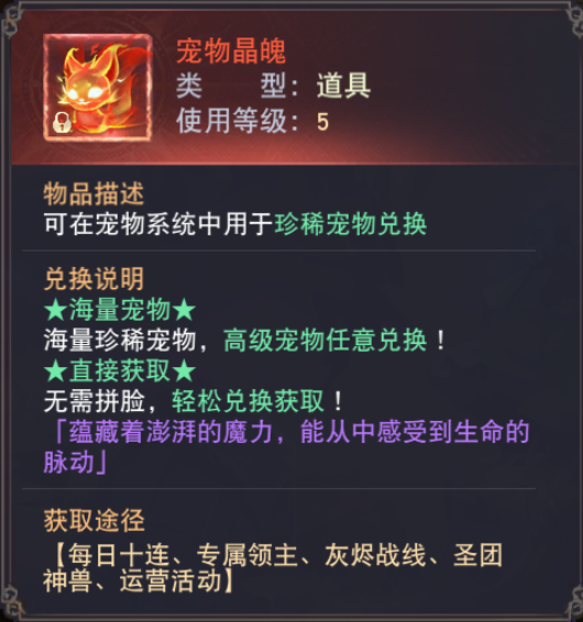描述:用于兑换珍稀宠物,可直接兑换高阶宠物。